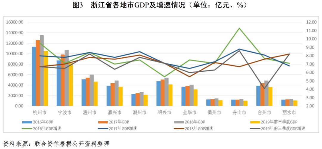 GDP方面,杭州市作為浙江省會城市長期處于領(lǐng)先地位,2017年和2018年,杭州市GDP分別為12603.36億元和13509.15億元,約占同期全省經(jīng)濟(jì)總量的25.00%;寧波市GDP規(guī)模長期排名全省第二,并于2018年首次突破10000億元,達(dá)到10745.46億元,約占同期全省經(jīng)濟(jì)總量的19.00%;2018年衢州市、舟山市和麗水市GDP均未超過1500億元,其余各地市除湖州市GDP相對較低(2719.07億元)外,其余地市的GDP均超過4000億元。從GDP增速看,杭州市、寧波市受區(qū)域經(jīng)濟(jì)總量規(guī)模較大影響,近年GDP增速有所下滑,2018年分別為6.70%和7.00%;同期麗水市和湖州市GDP增速居全省前兩位,分別為8.20%和8.10%;剩余各地市GDP增速均位于6.70%―7.80%區(qū)間,2018年浙江省各地市的GDP增速均高于同期全國GDP增長水平(6.60%)。2019年1―9月,杭州市GDP持續(xù)較快增長,累計(jì)完成10511.36億元,同比增長6.70%;臺州市受中美貿(mào)易摩擦及臺風(fēng)“利奇馬”影響,GDP增速大幅降至4.10%,同期實(shí)現(xiàn)GDP3629.49億元;剩余各地市GDP均較穩(wěn)健發(fā)展,增速同比變化不大。