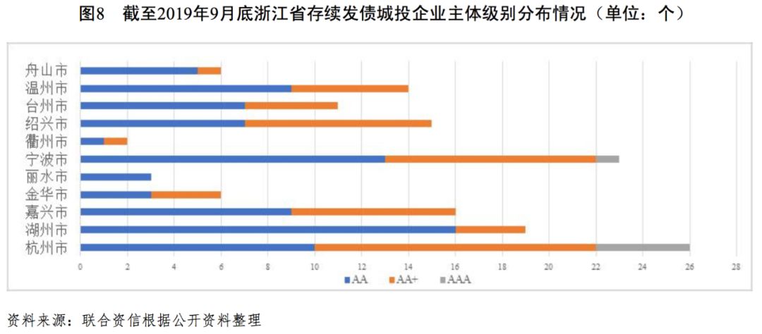 浙江省區(qū)域經(jīng)濟(jì)發(fā)展水平差異較大,省內(nèi)經(jīng)濟(jì)發(fā)達(dá)縣域數(shù)量較多,根據(jù)《2019年度全國綜合實(shí)力百強(qiáng)縣市/區(qū)》,浙江省共15個縣、18個區(qū)上榜,數(shù)量僅次于江蘇省,位列全國第2名。截至2019年9月底,浙江省有公開發(fā)行債券的城投企業(yè)共141家[1],其中地市、區(qū)縣和園區(qū)級城投企業(yè)分別為23家、90家和28家。從區(qū)域分布情況看,杭州市城投企業(yè)26家,寧波市城投企業(yè)23家,湖州市、嘉興市和紹興市的城投企業(yè)分別為19家、16家和15家,其他地市的城投企業(yè)均不足15家。從存續(xù)債券償債主體級別分布看,浙江省內(nèi)有AAA級城投企業(yè)5家,分別為杭州、寧波市級平臺以及杭州市蕭山區(qū)、余杭區(qū)區(qū)級平臺;AA+級城投企業(yè)53家,以杭州、寧波、湖州、嘉興、溫州和紹興市屬及下轄區(qū)縣級城投企業(yè)為主;剩余均為AA級。