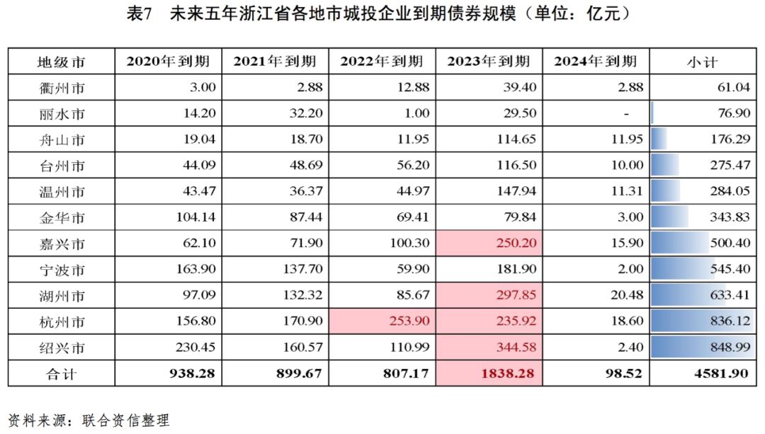 從各地市城投企業(yè)存量債券集中償付壓力看,嘉興市、湖州市、紹興市、溫州市和舟山市城投企業(yè)存量債券集中兌付壓力較大,均將于2023年達(dá)到兌付高峰,當(dāng)年分別需償還250.20億元、297.85億元、344.58億元、147.94億元和114.65億元,其中紹興市于2020年亦存在一定集中兌付壓力,當(dāng)年需償還債務(wù)總額230.45億元;其余地市城投企業(yè)存量債券集中兌付壓力相對較小;但杭州市城投企業(yè)存量債券余額較大,在2022—2023年到期債務(wù)規(guī)模較高。