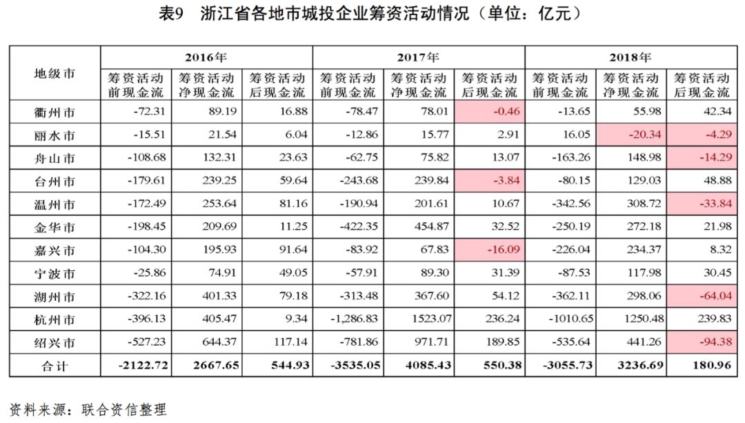 從籌資活動前凈現(xiàn)金流來看,2016—2018年,浙江省各地市城投企業(yè)籌資活動前現(xiàn)金流主要呈凈流出態(tài)勢,且凈流出規(guī)模波動中有所增長,2018年為3055.73億元。2018年,麗水市籌資活動前現(xiàn)金流呈凈流入態(tài)勢,但規(guī)模較小。