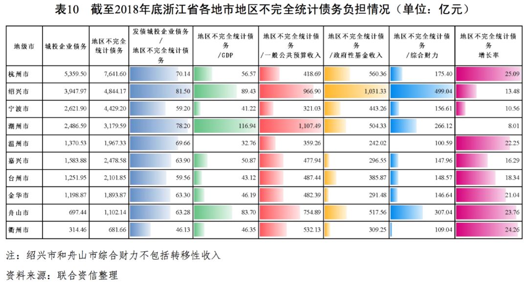從地區(qū)不完全統(tǒng)計(jì)債務(wù)負(fù)擔(dān)看,湖州市、紹興市、舟山市和杭州市地區(qū)不完全統(tǒng)計(jì)債務(wù)/GDP超過50%,其中湖州市超過100%,為116.94%;從各地市的綜合財(cái)力、一般公共預(yù)算收入和政府性基金收入對地區(qū)不完全統(tǒng)計(jì)債務(wù)的保障支持程度看,紹興市、湖州市和舟山市財(cái)政收入對發(fā)債城投企業(yè)債務(wù)的保障支持程度低。