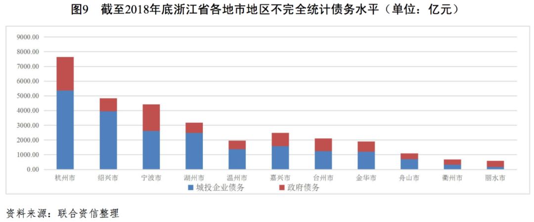 從地區(qū)不完全統(tǒng)計(jì)債務(wù)規(guī)模看,杭州市地區(qū)不完全統(tǒng)計(jì)債務(wù)規(guī)模最高,2018年底為7641.60億元;其次為紹興市、寧波市和湖州市,地區(qū)不完全統(tǒng)計(jì)債務(wù)分別為4844.17億元、4429.20億元和3179.59億元;溫州市、嘉興市、臺州市、金華市和舟山市地區(qū)不完全統(tǒng)計(jì)債務(wù)在1000—2500億元之間,衢州市和麗水市均低于700億元。從地區(qū)不完全統(tǒng)計(jì)債務(wù)增長率看,杭州市、溫州市、金華市、舟山市和衢州市地區(qū)不完全統(tǒng)計(jì)債務(wù)規(guī)模同比增速在20%以上,湖州市地區(qū)不完全統(tǒng)計(jì)債務(wù)同比增長8.0%,其余城市同比增速在10%―20%之間。從城投企業(yè)債務(wù)與地區(qū)不完全統(tǒng)計(jì)債務(wù)的比值看,舟山市和衢州市政府債務(wù)占比大于發(fā)債城投企業(yè)債務(wù),其余各地市發(fā)債城投企業(yè)債務(wù)占比均大于政府債務(wù),其中湖州市和紹興市發(fā)債城投企業(yè)債務(wù)占地區(qū)不完全統(tǒng)計(jì)債務(wù)比很高,分別為81.50%和78.20%。