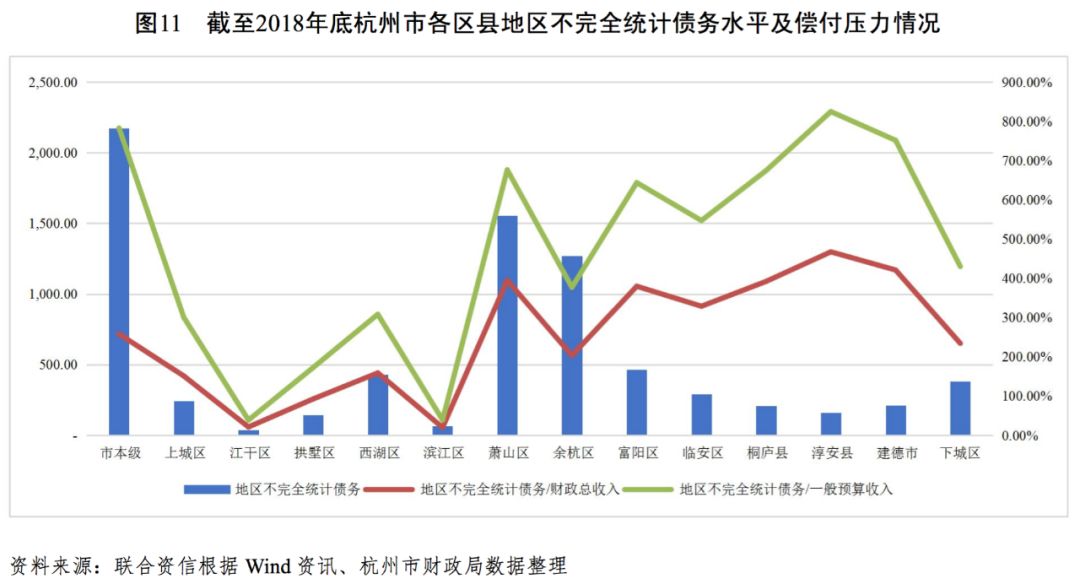 從債務(wù)償付壓力看,與一般公共預(yù)算收入規(guī)模相比,截至2018年底杭州市地區(qū)不完全統(tǒng)計(jì)債務(wù)占一般預(yù)算收入比為418.70%;其中,市本級、建德市和淳安縣較為突出,占比分別為782.85%、751.45%和824.48%,地區(qū)不完全統(tǒng)計(jì)債務(wù)與其地方財(cái)政實(shí)力匹配程度較低;其次為蕭山區(qū)、桐廬縣、富陽區(qū)和臨安區(qū),占比均在500%以上;其余各行政區(qū)均在平均值以下。與財(cái)政總收入規(guī)模相比,2018年底杭州市地區(qū)不完全統(tǒng)計(jì)債務(wù)占財(cái)政總收入比為221.02%;其中蕭山區(qū)、桐廬縣、淳安縣、建德市較突出,占比均超過390%;其次為富陽區(qū)和臨安區(qū),占比均在300%以上;其余各行政區(qū)均在260%以下。