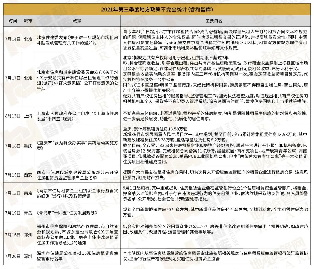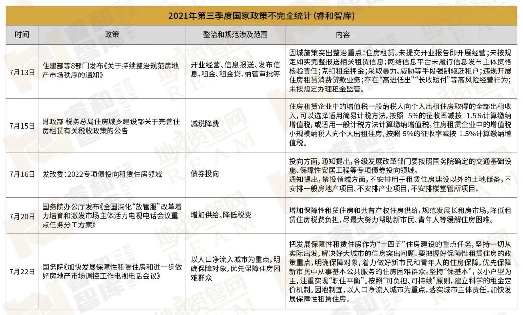 黨的“十九大”報(bào)告明確提出要加快建立多主體供給、多渠道保障、租購并舉的住房制度。2021年以來,土地、稅費(fèi)等多維度利好政策頻頻推出。睿和智庫以2021年第三季度為周期進(jìn)行了部分梳理。