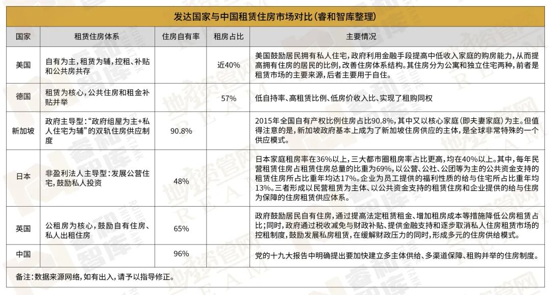 美國、德國、日本、新加坡、英國等發(fā)達(dá)國家都擁有比較成熟發(fā)達(dá)的住房租賃市場和完善的住房租賃政策。租賃是住房供應(yīng)的“雙引擎”之一,一般占據(jù)40%~60%的市場份額。其中,新加坡供應(yīng)模式非常特殊,政府基本上成為了住房供應(yīng)的主體。