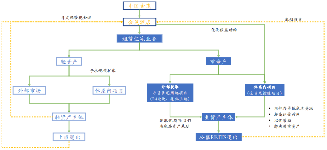 如何輕重結(jié)合?以金茂為例,公寓業(yè)態(tài)優(yōu)先尋求規(guī)模擴(kuò)張,夯實(shí)底層重資產(chǎn)基礎(chǔ),并在形成現(xiàn)金流的基礎(chǔ)上,提升體系內(nèi)滯重資產(chǎn)的運(yùn)營效率,并將滿足條件的體系內(nèi)自持部分裝入重資產(chǎn)主體,構(gòu)建公募REITs底層資產(chǎn), 打通投融管退全生命周期。