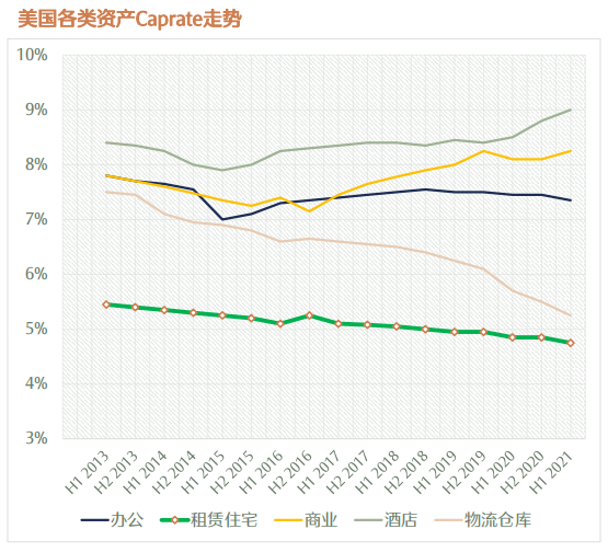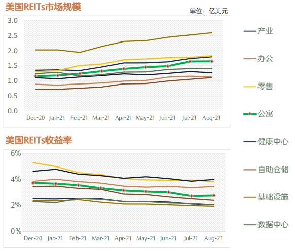 從2013年至今美國各類資產(chǎn)資本化率走勢來看,單看美國REITs市場規(guī)模和收益率走勢,除了IDC、物流資產(chǎn)之外,投資人對(duì)長租公寓的投資一直處于上升趨勢。