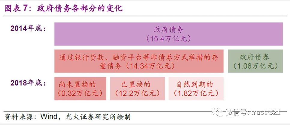 下面是截止2018年底ZF債務規模的構成。經過4年置換后,原先2014年底認定的15.4萬億可置換ZF存量債務中,只剩下3200億債務是以非地方債形式存在,也意味著置換債就這么大存量發行空間了。