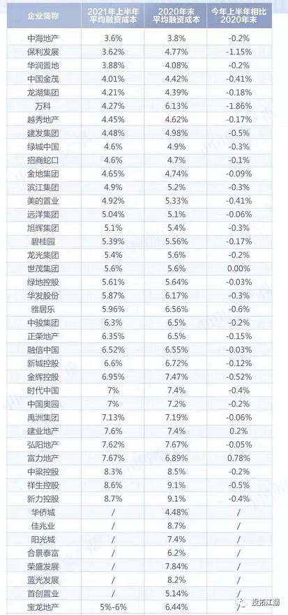 前陣子,很多房企都過了自己的2021年中報季,也大多公布了自己的綜合融資成本,我們找了一份機構機構統計的,上市房企前50強融資成本對比表,如下圖: