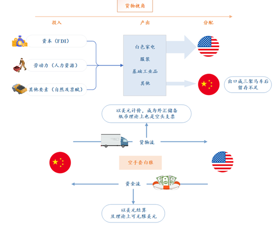 淺層看,中美貿易摩擦是貿易順差引發(fā)的世界間資本-貨物的流動失衡;美國作為消費者,我們承擔生產者:而以美元計價的內在矛盾是,美國本質上是獲利更大一方