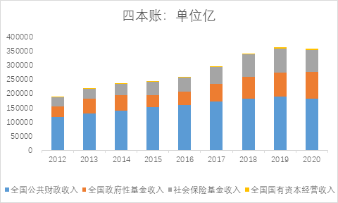 此外,如果我們再看財政支出來看,同樣以4本賬衡量的支出規(guī)模2020年在44.50萬億(同樣會有重復加總的問題),剔除掉重復的部分,簡單來看赤字規(guī)模也在4-5萬億體量。
