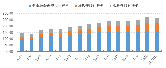 細分部門來看:居民部門在持續(xù)上升;但是最大的還是占比還是非金融企業(yè)部門;但是由于融資平臺這一馬甲存在,企業(yè)部門的杠桿率是顯著高估;而政府債務則可能低估。