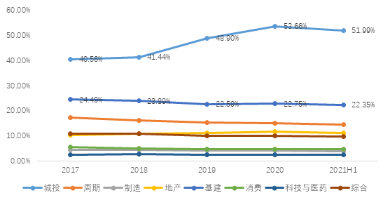 由于數據缺失,我們繼續(xù)缺失,通過發(fā)債主體(這里是以偏概全,數據會低估)針對行業(yè)大類拆分,可以來看細分行業(yè)的杠桿率攀升:假設隱性債務限定領域在融資平臺和基建投放上,兩者累計杠桿率到74%;而城投更多衡量的地方視角的債務、基建衡量的是中央層面的項目。