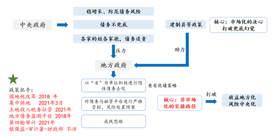 這一視角,央地的角力一直存在。所以地方上,為了發(fā)展而舉債,成為口號正確非常大的掩蓋;但是綜合我們第一部分的闡述:離開階段性、劑量談問題,是鏡中撈月。那站在現實背景下,我們清晰的浮出以下脈絡:
