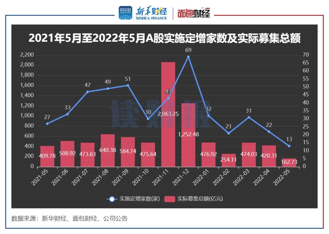 統(tǒng)計顯示,2022年5月,A股上市公司共計實施定增13起,實際募資總額約162.73億元,定增實施家數(shù)及實際募集資金較上月均有明顯下降,較上年同期相比也有較大差距。