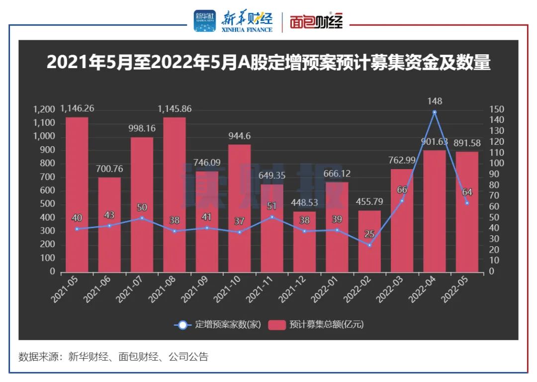 以首次披露預(yù)案公告日統(tǒng)計,2022年5月A股上市公司披露的定增預(yù)案(同一定增預(yù)案下的募資及配套募資合并統(tǒng)計,下同)共計64起,環(huán)比下降84起;預(yù)計募資規(guī)模合計約891.58億元,與上月相比微降1.11%。