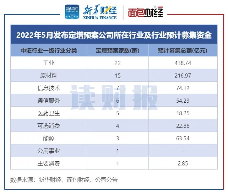 從行業(yè)分布來看,以中證行業(yè)統(tǒng)計,2022年5月,工業(yè)有22家公司發(fā)布定增預(yù)案,數(shù)量排在各行業(yè)之首;原材料行業(yè)排在第二位,有15家公司發(fā)布定增預(yù)案;信息技術(shù)行業(yè)有7家發(fā)布定增預(yù)案,位列第三位。