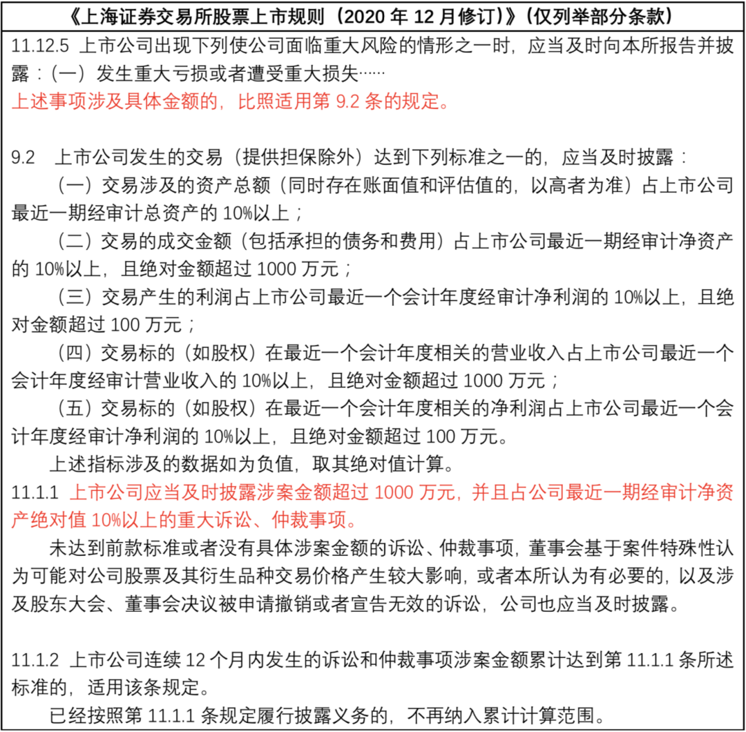 對于公司發生重大債務和未能清償到期重大債務的違約情況、涉及重大訴訟或仲裁等具體達到何種金額才能構成重大事件應當予以披露,交易所的相關規則有明確規定,以《上海證券交易所股票上市規則(2020年12月修訂)》為例: