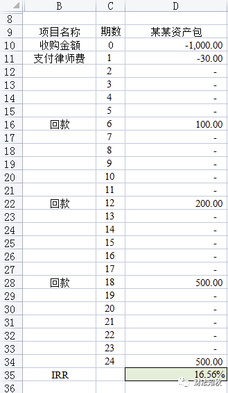 基于不良資產(chǎn)投資的特性:投資周期長(zhǎng)、現(xiàn)金流波動(dòng)大,投資期內(nèi)多次投入,多次回現(xiàn)。為了充分反映資金的時(shí)間價(jià)值,測(cè)算收益率時(shí)建議使用內(nèi)部收益率IRR法來(lái)進(jìn)行計(jì)算不良資產(chǎn)投資的收益率。