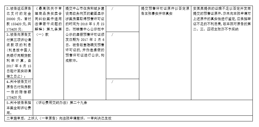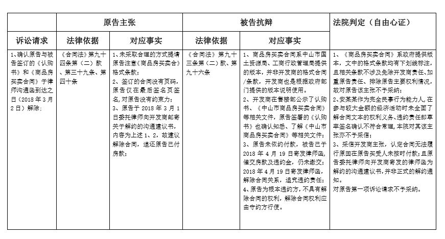 案情背景:原告安某向被告開發(fā)商認(rèn)購一套商品房,分別于2017年6月8日、6月15日簽訂《認(rèn)購書》、《中山市商品房買賣合同》,約定開發(fā)商將位于中山市西區(qū)某幢1001房(以下簡稱案涉商品房)出售給原告,原告于2017年6月8日、6月15日分別向被告交付定金20000元、首付款155420元,共176150元至指定被告賬戶。2018年3月1日,原告委托律師向被告發(fā)出律師溝通函,要求解除雙方簽訂的認(rèn)購書及商品房買賣合同,要求開發(fā)商退還定金和購房款。被告不同意,業(yè)主遂向法院起訴。原告對自己提出的訴訟請求所依據(jù)的事實(shí),以及被告反駁原告訴訟請求所依據(jù)的事實(shí),以及法官根據(jù)法律規(guī)范(法律法規(guī)及相關(guān)司法解釋)及證據(jù)規(guī)則,在自由心證的基礎(chǔ)上認(rèn)定如下表: