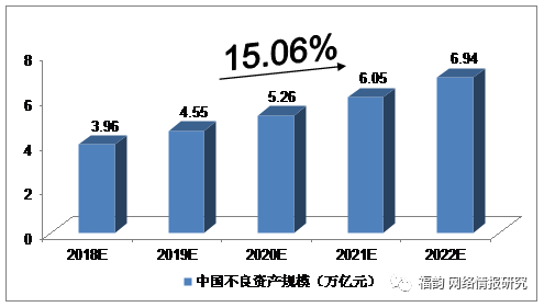 當前,我國不良資產市場規模繼續呈擴大之勢,預計2018-2022年不良資產規模均復合增長率約為15.06%,2022年將達到6.94萬億元。