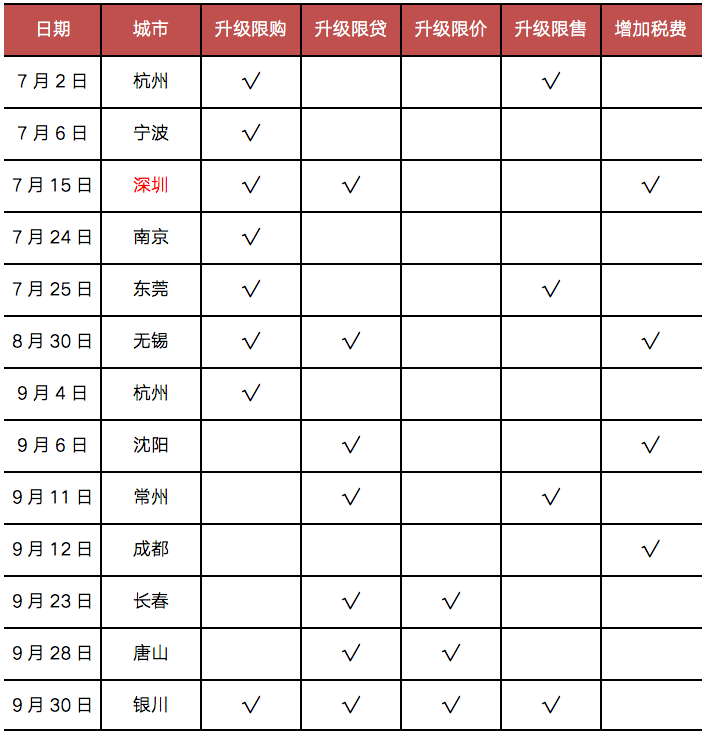 三季度最后一天的9月30日,銀川升級房地產調控政策,至此,參加7月24日座談會、8月26日城市會商會的14個城市中,除了北上廣以外11個城市全部完成了新政策出臺,而深圳政策力度最為嚴苛。
