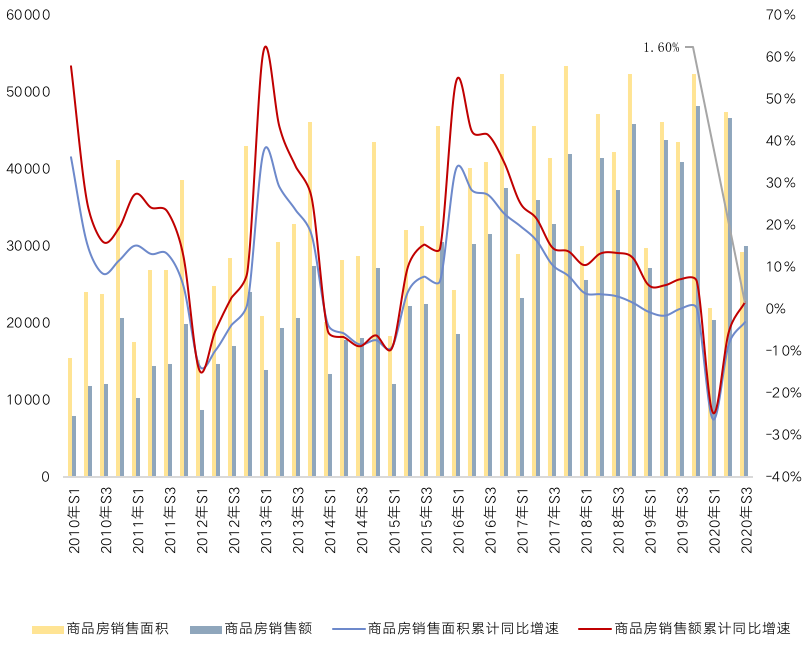 從行業數據來看,2020年第三季度,全國新房銷售恢復顯著提速,至8月商品房銷售額累計增速回正,單月規模創正常月份(除6、12月外)新高。據國家統計局數據顯示:前8月全國商品房銷售面積9.8億平方米,同比下降3.3%,降幅比上半年收窄5.1個百分點。商品房銷售額96943億元,增長1.6%,其中住宅銷售額增長4.1%。