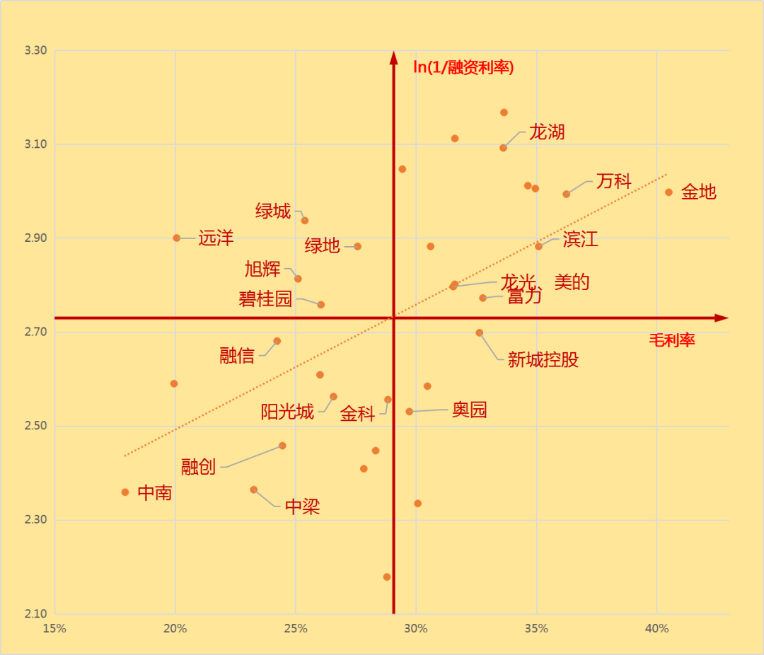 如果沒有去年王振華事件,以新城控股現(xiàn)在的融資利率-毛利率水平應(yīng)該進(jìn)入第一象限。