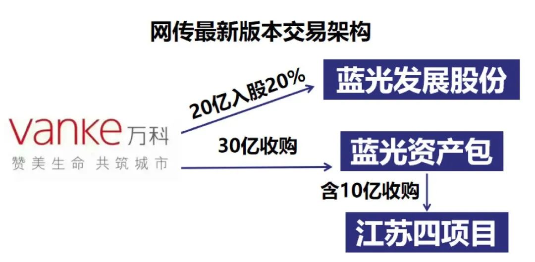 20億收購藍光發展20%的股權,30億收購藍光的項目資產包,交易對價50個億。并非是之前外界傳的80億。
