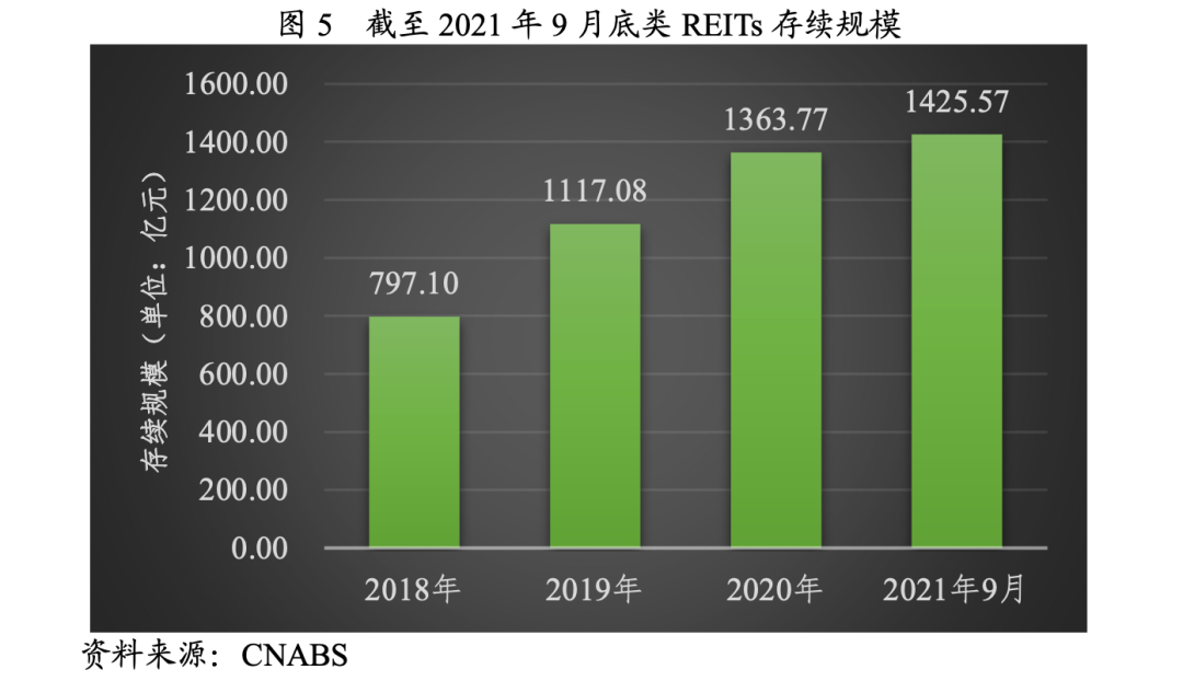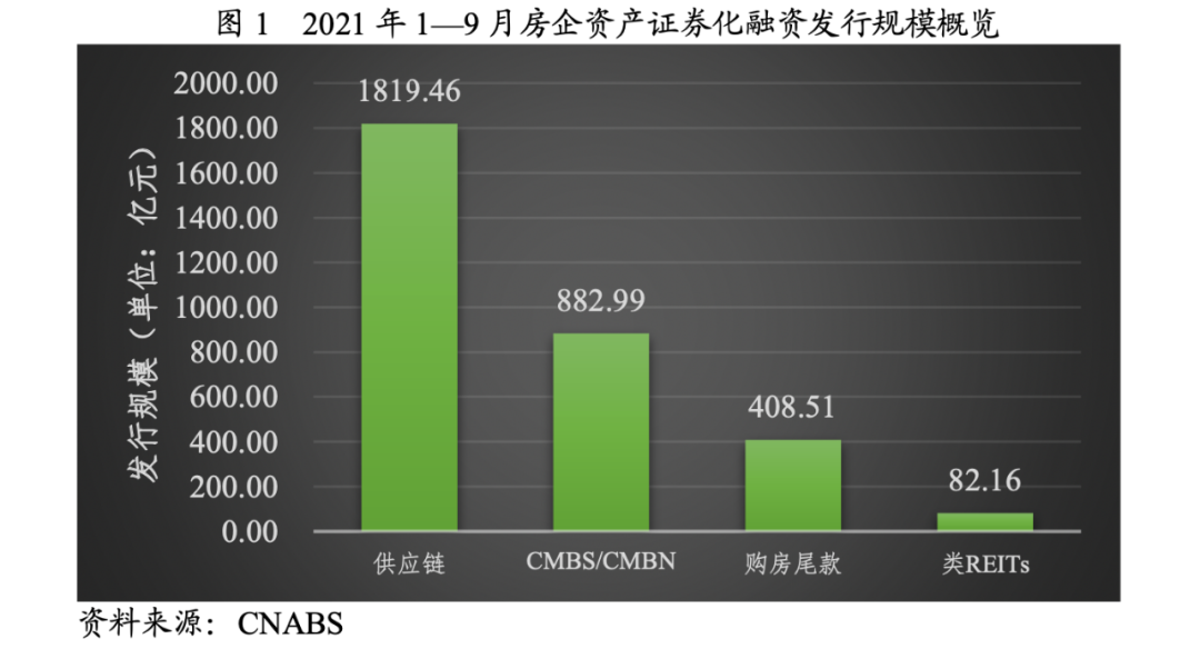 從發(fā)行情況來看,2021年1~9月,房企資產(chǎn)證券化產(chǎn)品發(fā)行總規(guī)模為3418.92億元,同比下降2.59%;其中供應(yīng)鏈ABS/ABN、CMBS/CMBN、類REITs和購房尾款為最主要的發(fā)行品種,發(fā)行規(guī)模分別為1819.46億元、882.99億元、82.16億元和408.51億元,如下圖所示。