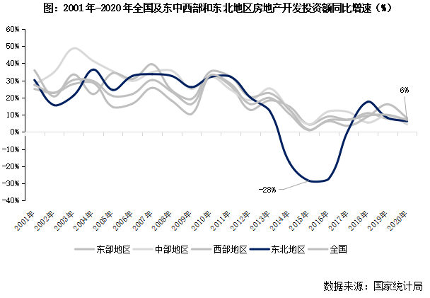 聚焦房地產(chǎn)行業(yè),自2010年開始,東北樓市成交也偏離了全國整體趨勢,走出了獨立的行情,一方面東北銷售面積增速明顯不及東、中、西部城市,2018年起連續(xù)3年負(fù)增長;另一方面,整體開發(fā)投資增速雖然在2017年由負(fù)轉(zhuǎn)正,但還是低于全國平均水平。不過核心二線城市諸如沈陽、長春表現(xiàn)還是可圈可點,均在2019年迎來一波放量小高峰,2020年受新冠影響下皆有回調(diào)。