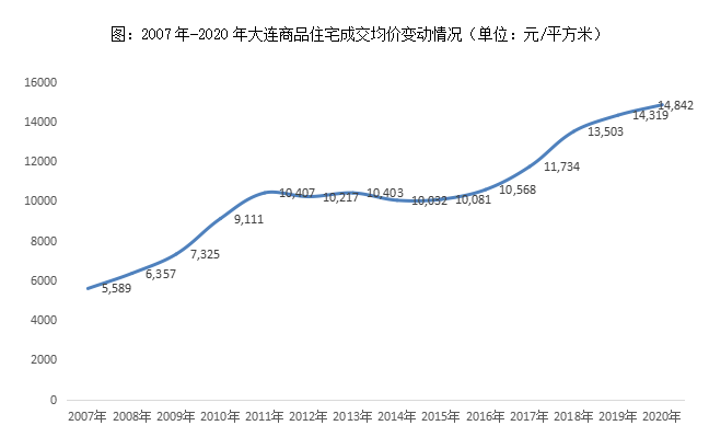 房價層面,大連商品住宅成交均價呈現(xiàn)出“階梯性”爬升特點:2017-2011年逐年遞增至房價破萬,2012-2016年高位持穩(wěn),并無太大波動,甚至出現(xiàn)小幅微降趨勢,2017年開始進(jìn)入新一輪爬升,2020年再度達(dá)到階段性高點,商品住宅成交均價高位維持在14842元/平方米。