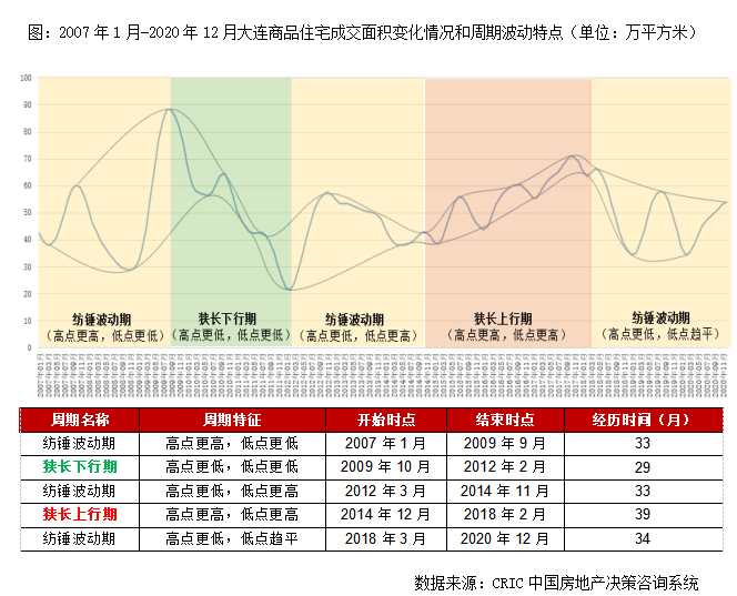 大連市場發(fā)展總體可分為兩個階段,2011年之前為“大漲大跌”的劇烈波動期,2012年之后高位持穩(wěn),波動加劇,波幅減小。而細(xì)化到月度數(shù)據(jù),可以看出大連成交變動每一個波段周期基本都持續(xù)在30-40個月之間,即3年為一周期,紡錘波動期和狹長上&下行周期緊密相連。