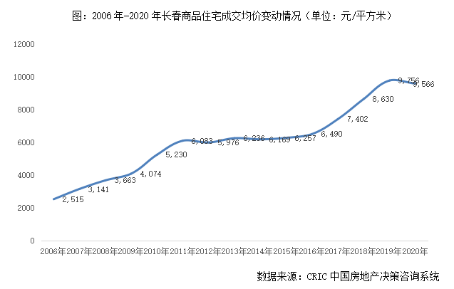 房價層面,長春商品住宅成交均價如大連一樣,也呈現(xiàn)出“階梯性”爬升特點:2017-2010年逐年遞增至房價破5000元/平方米,2011-2016年高位持穩(wěn)在6000元/平方米,并無太大波動,2017年開始進(jìn)入新一輪爬升,2019年再度達(dá)到階段性高點,商品住宅成交均價高位維持在9756元/平方米,2020年小幅微降至9566元/平方米,至今房價尚未破萬。