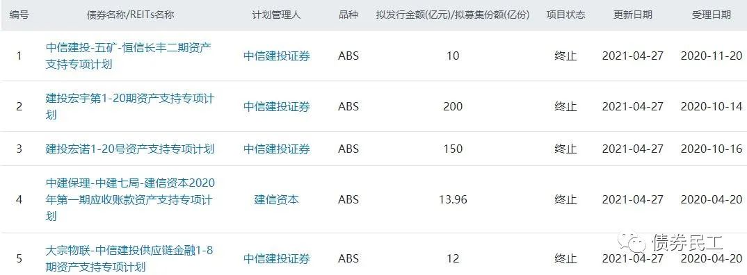 從本次終止的ABS產(chǎn)品規(guī)模來(lái)看,終止產(chǎn)品金額最大的為200億元,終止金額最小的為10億元。從本次終止的ABS產(chǎn)品審核時(shí)間來(lái)看,審核周期最長(zhǎng)的項(xiàng)目已經(jīng)一年,比如中建保理-中建七局-建信資本2020年第一期應(yīng)收賬款資產(chǎn)支持專項(xiàng)計(jì)劃是在2020年4月20日申報(bào)的;審核周期最短的項(xiàng)目5個(gè)月,比如中信建投-五礦-恒信長(zhǎng)豐二期資產(chǎn)支持專項(xiàng)計(jì)劃是在2020年11月20日申報(bào)的。本次終止的資產(chǎn)支持證券產(chǎn)品情況如下: