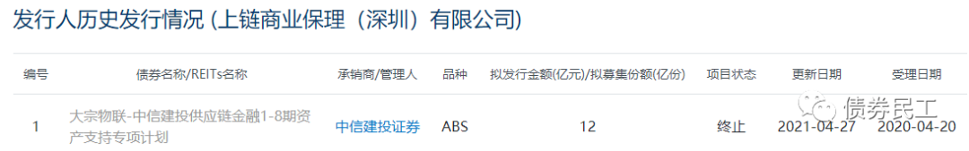 5、大宗物聯(lián)-中信建投供應(yīng)鏈金融1-8期資產(chǎn)支持專項(xiàng)計(jì)劃擬發(fā)行規(guī)模為12億元,發(fā)行人為上鏈商業(yè)保理(深圳)有限公司,此前未申報(bào)過(guò)ABS產(chǎn)品。