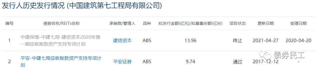 4、中建保理-中建七局-建信資本2020年第一期應(yīng)收賬款資產(chǎn)支持專項(xiàng)計(jì)劃擬發(fā)行規(guī)模為13.96億元,發(fā)行人為中國(guó)建筑第七工程局有限公司,此前申報(bào)過(guò)一單ABS產(chǎn)品:2017年申報(bào)的總額為9.74億元的產(chǎn)品通過(guò)。