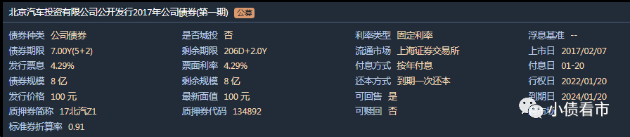 《小債看市》統計,目前北汽投資僅存續“17北汽01”一只債券,當前余額8億,票息4.29%,期限為7(5+2)年,將于2024年1月20日到期,明年1月面臨回售。
