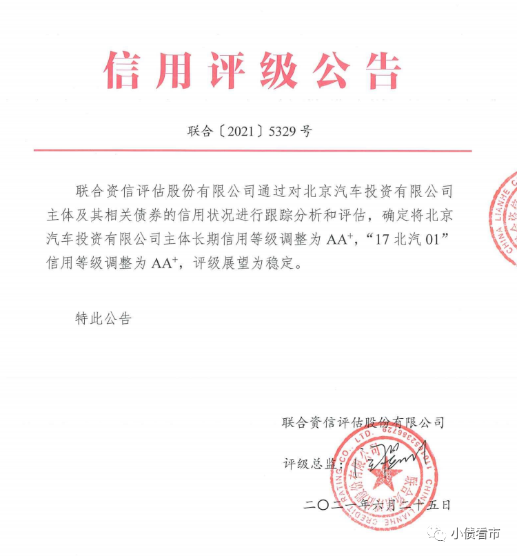 6月28日,聯合資信公告稱,確定將北京汽車投資有限公司(以下簡稱“北汽投資”)主體長期信用等級調整為AA+,“17北汽01”的信用等級為AA+,評級展望為穩定。