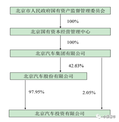 從股權結構看,北汽投資的控股股東為北汽股份(1958.HK),持股比例為97.95%,公司實際控制人為北京市國資委。