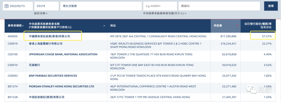 因為雅生活是H股結(jié)構公司,大股東通過境內(nèi)公司持有雅生活股份。顯示在港交所中央結(jié)算系統(tǒng)中,大股東的賬戶由中證登持有。▼