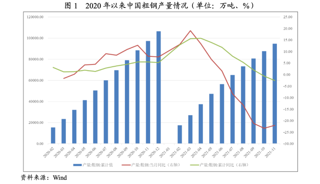 2021年1―11月,中國生鐵、粗鋼和鋼材產量分別為79623萬噸、94636萬噸和122333萬噸,同比分別下降4.20%、下降2.60%和增長1.00%。從月度走勢看,自2021年4月開始月度粗鋼產量增速有所放緩,7月起月度粗鋼產量同比增速由正轉負,且降幅不斷擴大,主要系下游需求轉弱以及限產施壓所致。
