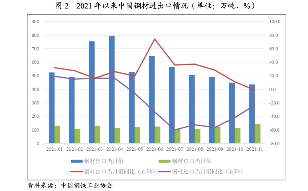 進出口方面,2021年1―11月,中國累計出口鋼材6187.5萬噸,同比增長26.7%,月度出口量呈現沖高回落態勢。其中,5月份環比大幅下降主要系5月1日起國家取消部分鋼材退稅政策以及國內外鋼材價差縮小所致。同期,中國累計進口鋼材1326.7萬噸,同比下降29.6%,月度進口量環比變動不大。