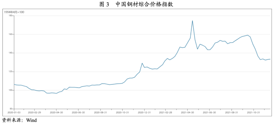 價格方面,2021年以來鋼材價格呈現先升后降、大幅波動態勢,但整體處于歷史高位。具體來看,2021年一季度受通脹預期以及成本抬升影響,鋼材價格開啟上漲趨勢;二季度,河北等地環保限產,同時疊加下游用鋼需求和投機需求旺盛,供需緊張推動鋼材價格持續上漲,并于5月漲至歷史高點;此后,隨著國家出臺了一系列調控政策以及下游需求放緩,鋼材價格有所回落,但由于原材料焦炭價格快速攀升至歷史高位,對鋼材價格形成一定支撐;10月底以來,焦炭價格在政府干預下明顯下降,同時疊加用鋼需求下降,鋼材價格大幅回落,但仍高于去年同期水平。
