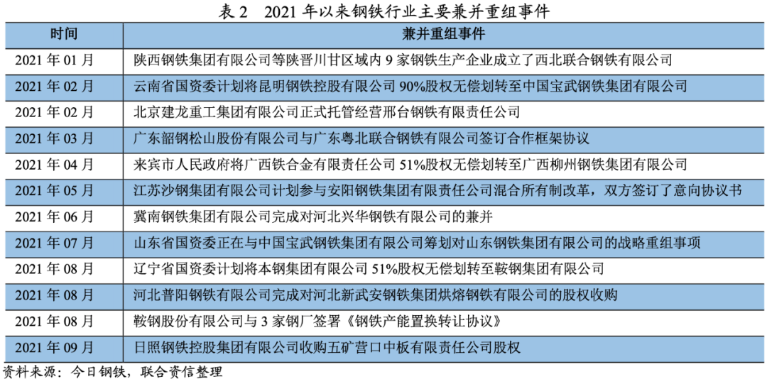 中國鋼鐵生產和消費有區域性特征,區域整合是鋼鐵行業實現結構優化和集中度提升的基礎,2021年以來鋼鐵企業兼并重組的步伐明顯加快。其中,鞍鋼集團有限公司重組本鋼集團有限公司,以6300萬噸/年的粗鋼產能成為國內第二大鋼企;中國寶武鋼鐵集團有限公司擬重組山東鋼鐵集團有限公司,產能規模將增至1.5億噸/年。在龍頭企業全國化布局的同時,不少中小型鋼鐵企業的兼并重組也動作頻頻。國內鋼鐵企業數量眾多,產能規模的差距也非常大,行業要形成有序的競爭格局,僅僅依靠龍頭企業的兼并重組還不夠,區域性小企業的整合也是必經之路。