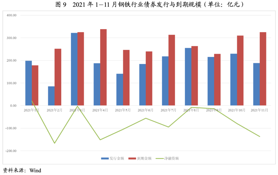 2021年以來,受益于經營效益向好,鋼鐵企業發債規模同比下降,債券凈融資規模持續為負,且下半年信用利差明顯改善;2022年到期的鋼鐵債券規模不大,行業整體償債壓力較小。