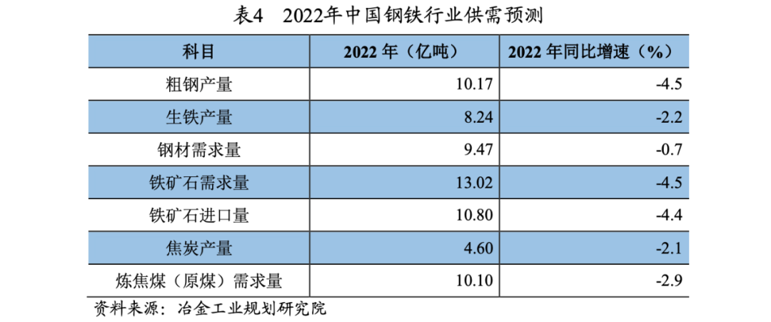 需求方面,短期內地產行業仍處于低迷態勢,基建投資回升幅度有限,制造業用鋼需求或有增長,但受建筑用鋼拖累較大影響,預計2022年整體用鋼需求仍較弱。