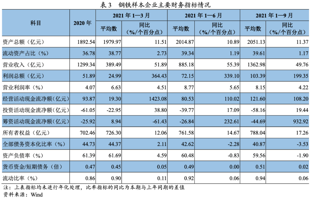 2021年以來,受政策調控影響,月度粗鋼產量呈現先增后降趨勢,1―11月累計粗鋼產量出現同比下降,預計全年可實現減產目標;鋼材價格先升后降,整體處于歷史高位,行業效益大幅上升,資產負債率處于歷史較低水平。