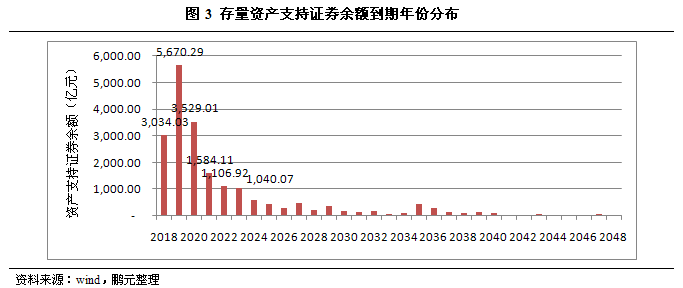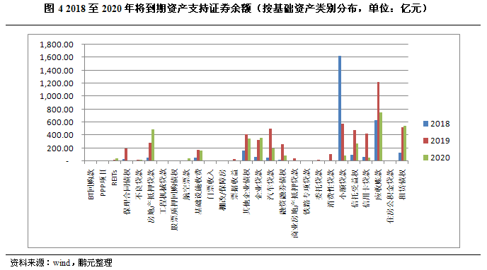 據wind統計,截至2018年8月1日,國內已發行3.98萬億元資產支持證券,仍在存續期內的存量資產支持證券規模為2.01萬億元。國內存量資產支持證券以債權類資產支持證券為主(見圖1),占比前五大的基礎資產類別包括個人住房抵押貸款、小額貸款、企業債券、租賃債權及汽車貸款。存量資產支持證券最新債項級別分布如圖2所示,目前國內存量資產支持證券級別仍以高級別為主。從資產支持證券到期年份分布上來看,目前國內存量的資產支持證券(見圖3)到期年份主要分布在2018年、2019年及2020年,其中2019年將有大規模資產支持證券到期,且2018年至2020年間到期的存量資產支持證券的基礎資產類別主要為小額貸款、應收賬款及租賃債權(見圖4)。