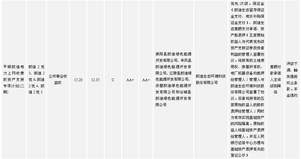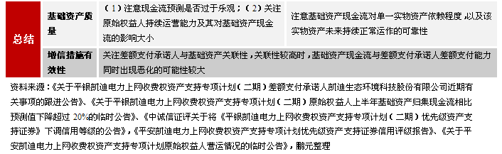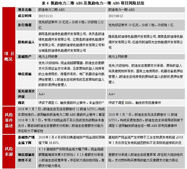 雖然一個標準化的證券化產品強調要實現破產隔離,以實現用資產信用代替主體信用的目的。但目前國內證券化項目的基礎資產對原始權益人持續運營能力依賴性強或需要原始權益人為基礎資產持續運營提供運營資金支持,并且有多數項目采用引入差額補償承諾或第三方擔保,從而導致目前國內證券化產品對主體的信用表現有較強的依賴性。在凱迪電力一期ABS項目中,存在因差額支付承諾人凱迪生態流動性資金緊張、無法支付燃料購買款,進而導致發電機組停機狀況。在凱迪電力二期ABS項目中,由于專項計劃現金流不足以完成優先級剩余本息兌付,需啟動凱迪生態差額支付機制,但凱迪生態差額支付能力存在卻較大不確定性。